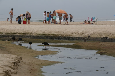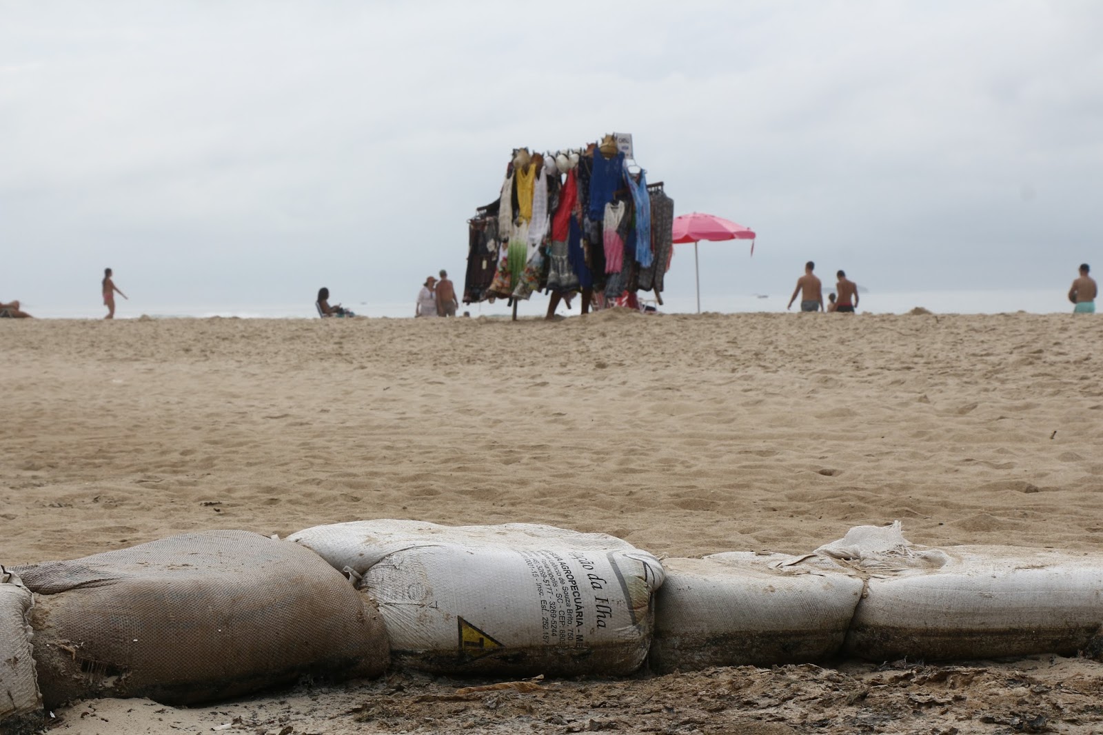 Seguimos andando e nos deparamos com mais um ponto de deságue de esgoto. Alguém colocou ali alguns sacos de areia para impedir que o fio de água verde chegue até o Rio do Noca ou até à praia, mas a coisa está ali, limosa e fedorenta.